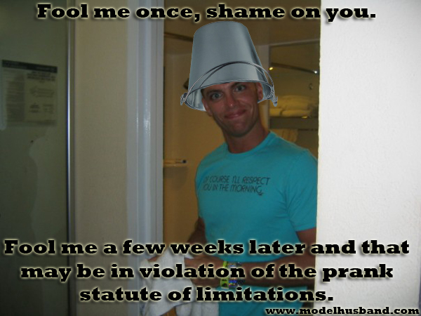 And that’s the reason why I think there should be a statute of limitations on prank retaliation in a marriage. Anyone can wait 3 to 6 months to retaliate; there’s no gamesmanship in that. The real challenge would be getting someone back within a previously agreed upon time period. Like two weeks. Yeah, two weeks. I think that’s an appropriate window for retaliation. Pranks that fall outside of this two week time period count as new transgressions and reset the retaliation clock.